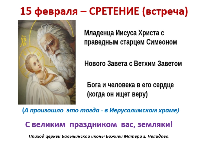 Великому православному празднику Сретение Господне и Всемирному дню православной молодежи, отмечаемым ежегодно 15 февраля, Нелидовское благочиние и его церковная социальная служба и в этом году тоже, по уже сложившейся традиции, посвятили одну из своих самых широкомасштабных акций — «Открытка к празднику».