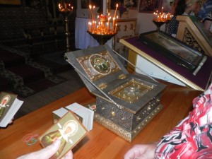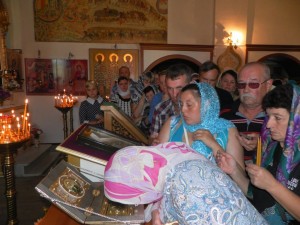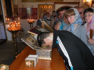 Народа пришло много, очередь к мощам была большая, но люди терпели. Терпели и больные и здоровые, и старые и молодые. Отдельно хочется отметить, что множество женщин пришло с цветами. Небольшой по сути дар, но зато искренний, сердечный.
