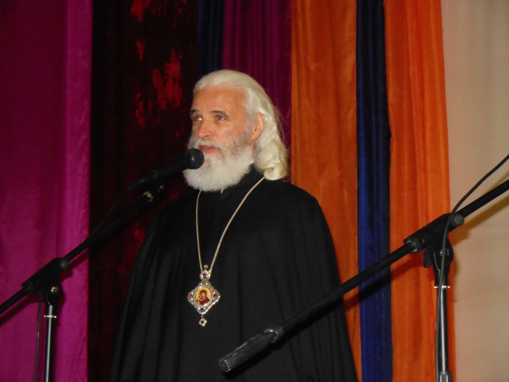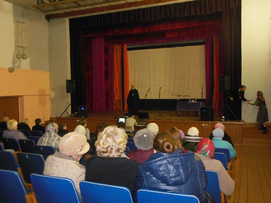 Вот и Дом культуры. Довольно просторный. Однако, свободных мест осталось не так уж и много. Общение построено следующим образом: из зала подают записки (но могут спросить и высказаться просто с места). Владыка отвечает. Вопросов множество – от самых будничных до предельно «заковыристых». Уход за огородом, политические перспективы РФ, вопросы межконфессиональные, ситуация в Сирии… Беседа продолжалась два с лишним часа. Владыка ответил на все вопросы. Затем – концерт. Короткий, но запомнившийся, от всей души.