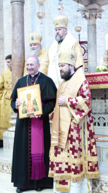 В свою очередь архиепископ Бари-Битонто Франческо Какуччи подарил митрополиту Илариону и сослужившим ему архиереям сосуды с миром от мощей святителя Николая.