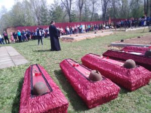 10 мая в селе Молодой Туд Оленинского района состоялось традиционное захоронение останков солдат, найденных поисковым отрядом «Орел». Бойцы были преданы земле с воинскими почестями, а иерей Александр Колосов отслужил по ним панихиду.