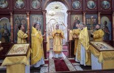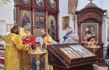 Его преосвященству сослужили настоятель собора иерей Сергий Макаров, иерей Владислав Феценко и диакон Дионисий Сударкин.