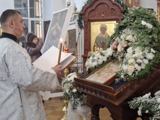 На вечерне Преосвященнейший Владыка возглавил чин литии, а по прочтении на утрене праздничного евангелия, помазал молящихся освященным елеем.