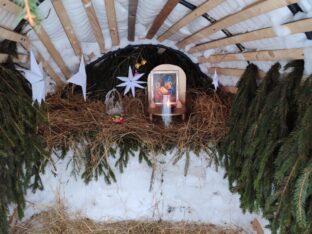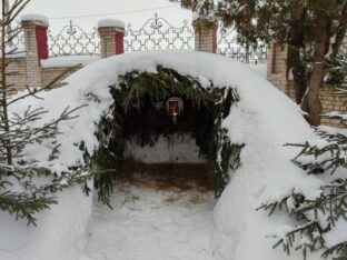 Батюшка показал рождественский снежный вертеп, с любовью украшенный ёлочными ветками, что стоит у входа в храм. Внутри ледяной пещерки стоит икона Рождества Христова и перед ней теплится огонёк лампадки.