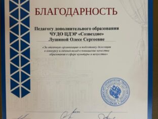 Педагог Лушина Олеся Сергеевна награждена благодарностью II Всероссийского фестиваля-конкурса среди хореографических коллективов «Точка притяжения».